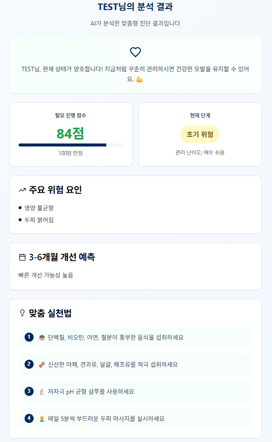 - 위험요인 자동 분석: 나에게 가장 취약한 탈모 원인 포인트를 알려줍니다.